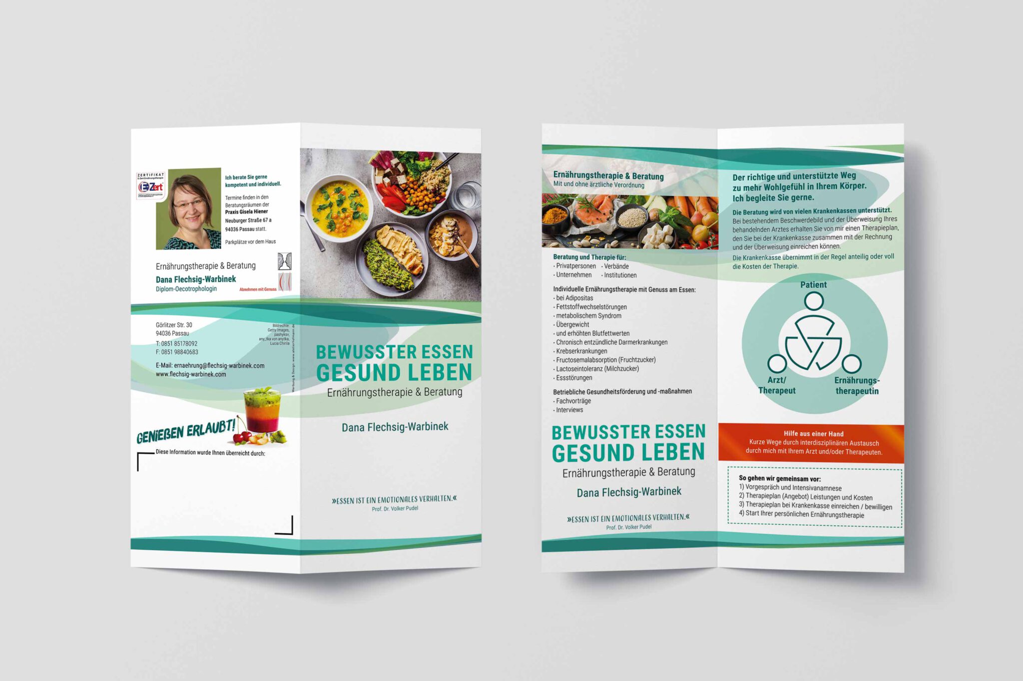 Für Dana Flechsig-Warbinek – Diplom Oecotrophologin in Passau – durfte ich einen modernen, emotional ansprechenden Flyer gestalten, der die Themen bewusstes Essen, gesünder leben und individuelle Ernährungsberatung sichtbar macht.